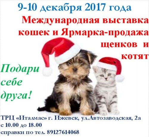 В субботу 30 сентября 2017 года на первом этаже ТРЦ "ИТАЛМАС" (г. Ижевск), по адресу: ул. Автозаводская, д. 2А, с 10:00 до 18:00 состоится городская ярмарка котят и щенков разных пород.
